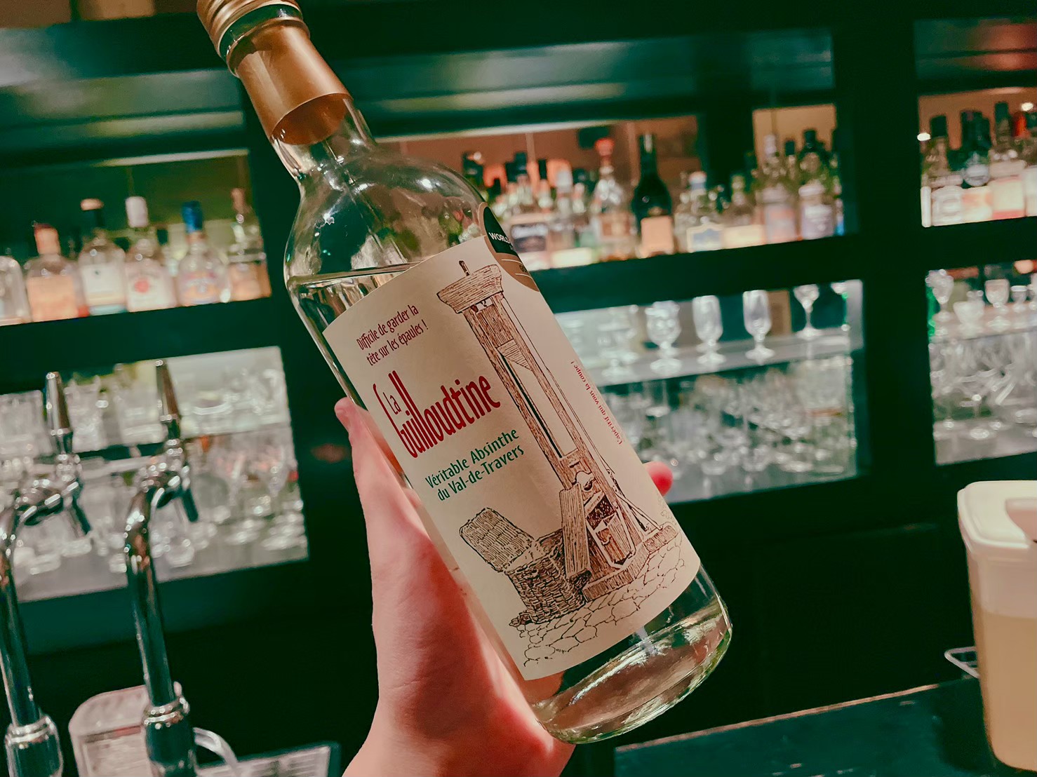 特徴的なギロチンのラベル。Guillotine(ギロチン)を文字ってGuilloudtine(ギウチン)と名付けられたこちらの1本は名前から連想されるようにニガヨモギのピリッとした鋭さのある味わいが特徴的です。