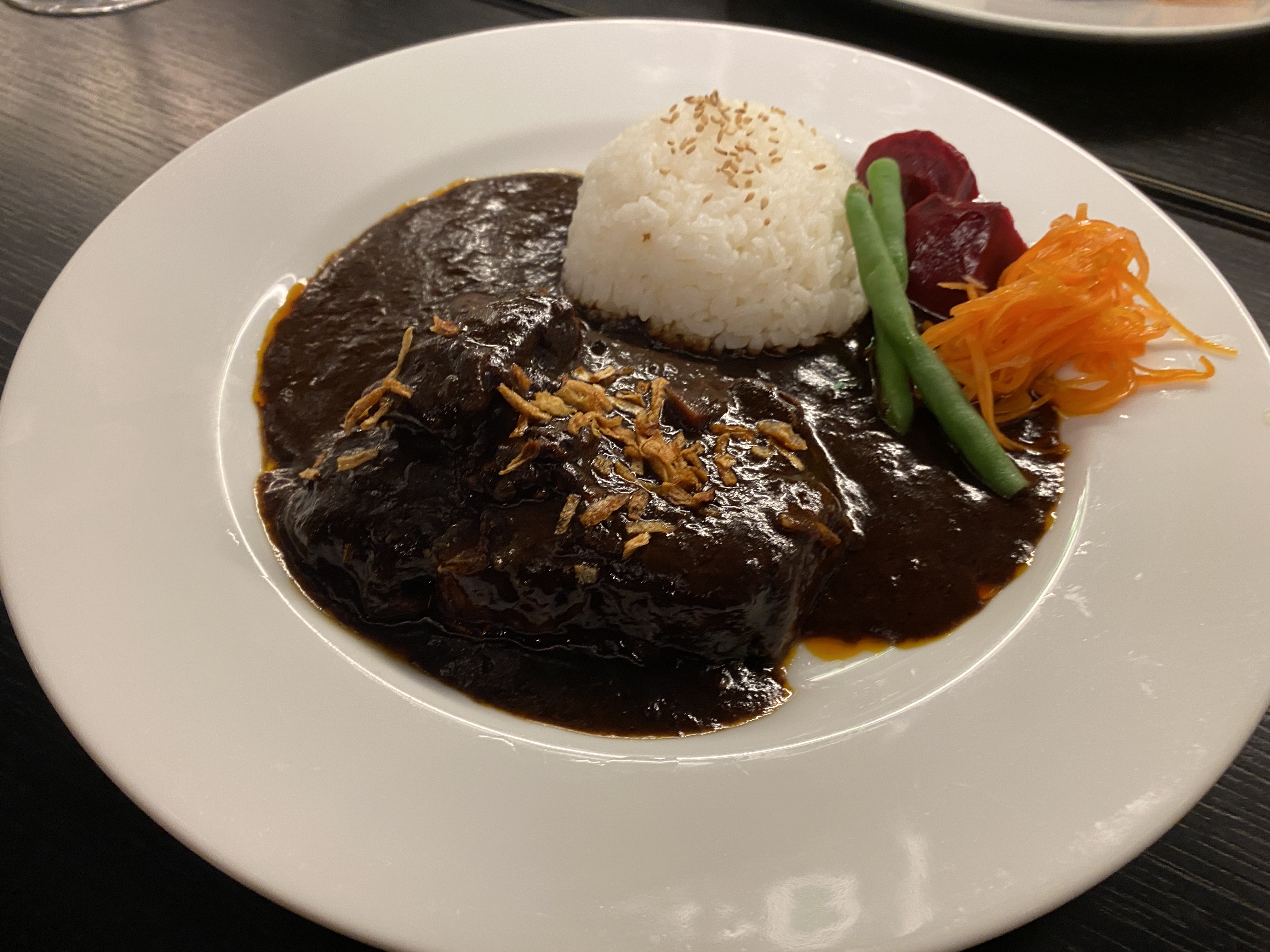 シンプルに玉ねぎをじっくりと汗をかくように透き通るまで蒸し(suer:仏)そこに水と赤ワインとスピークリングとデミグラスを。