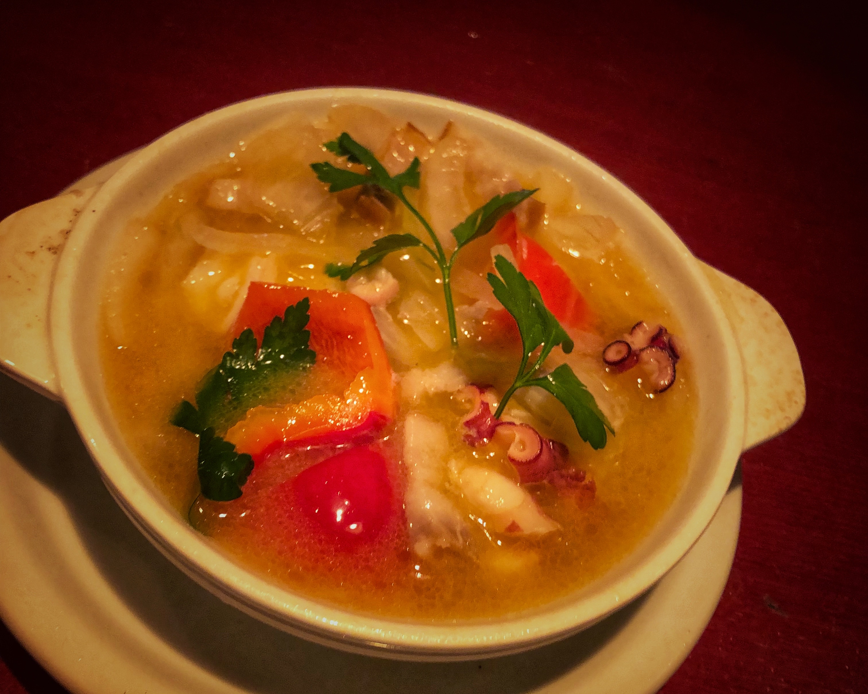 今回の真蛸とパプリカのアヒージョは真蛸の旨味とパプリカの香り、そしてスパイスカルダモンも加えています。